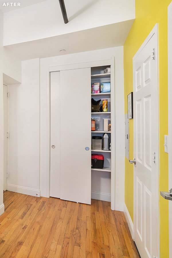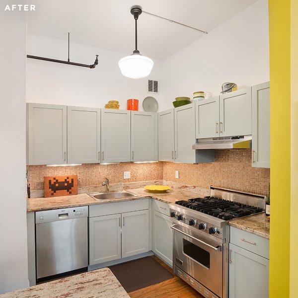 Erica és Donna felújították a konyhaszekrényt is. Az eredeti cseresznyefa bútort halványkékre festették, ami tökéletes kiegészítője a lakás színeinek. A konyha mögött még ey kis tolajtós szekrényt is kialakítottak, hogy el tudják rejteni szem elől a nem használt dolgokat.